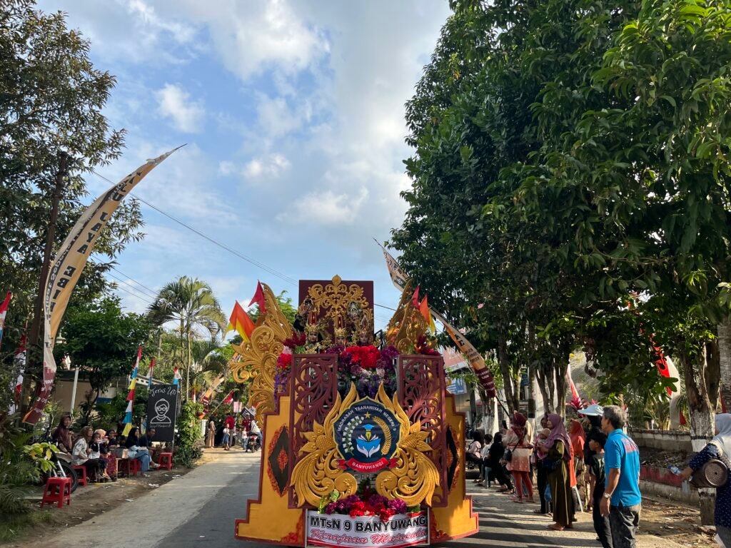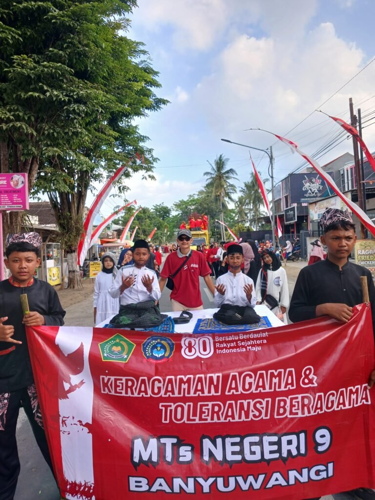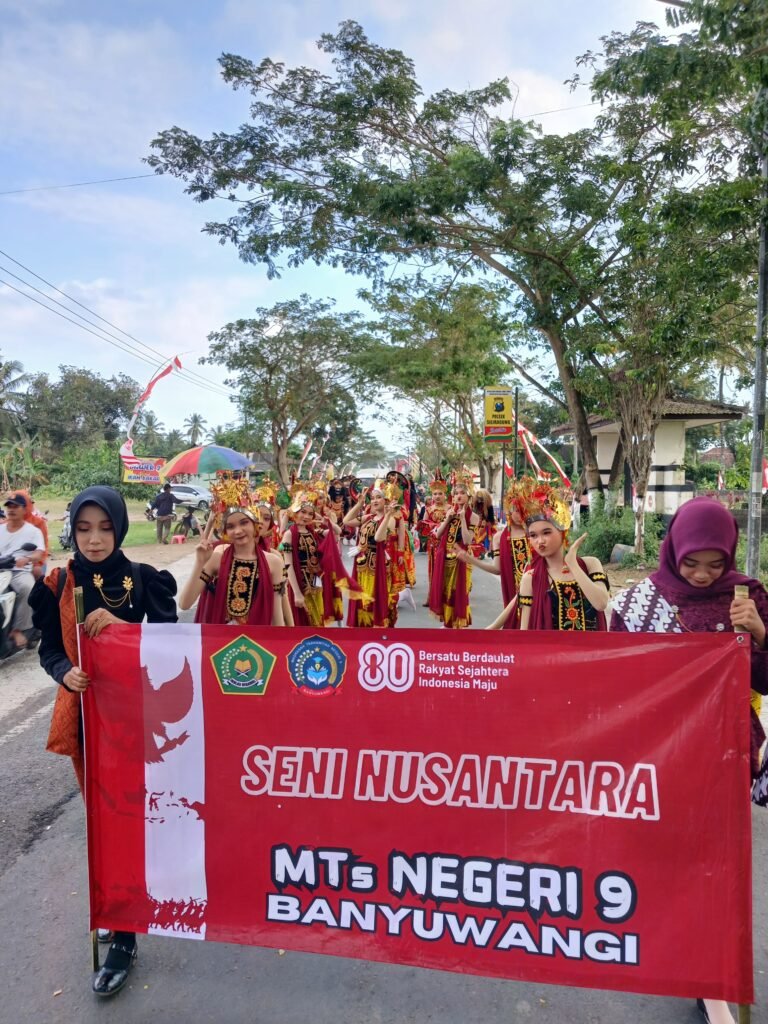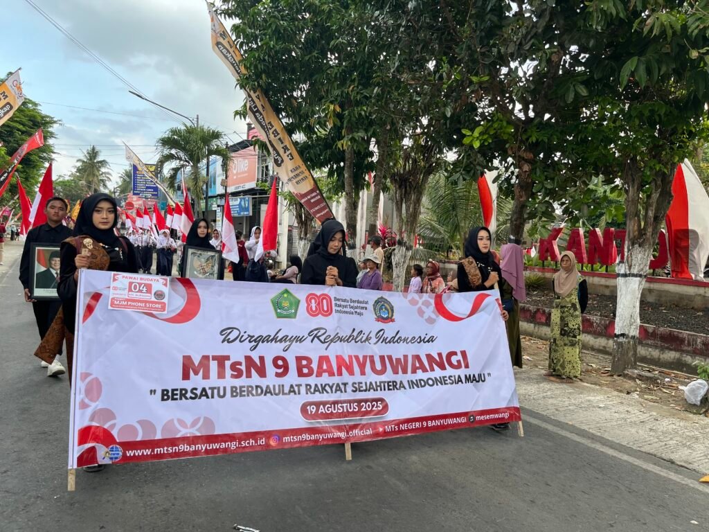 Senin, 18/08/2025 – Pawai Budaya Kecamatan Siliragung berlangsung dengan meriah. Ratusan peserta dari berbagai sekolah dan lembaga turut serta menampilkan kekayaan seni dan tradisi daerah. Salah satu penampilan yang mencuri perhatian datang dari MTsN 9 Banyuwangi dengan konsep atraksi budaya yang terstruktur dan penuh simbol kebangsaan.